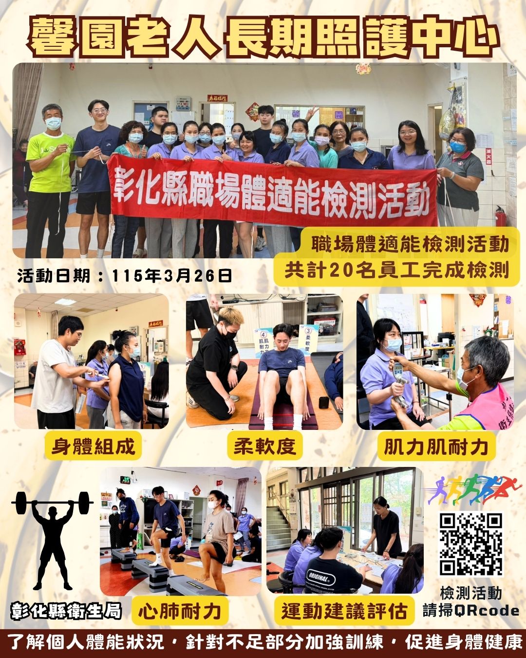 彰化縣衛生局115年3月26日於馨園老人長期照護中心舉行職場體適能檢測活動,共計20名員工完成檢測。