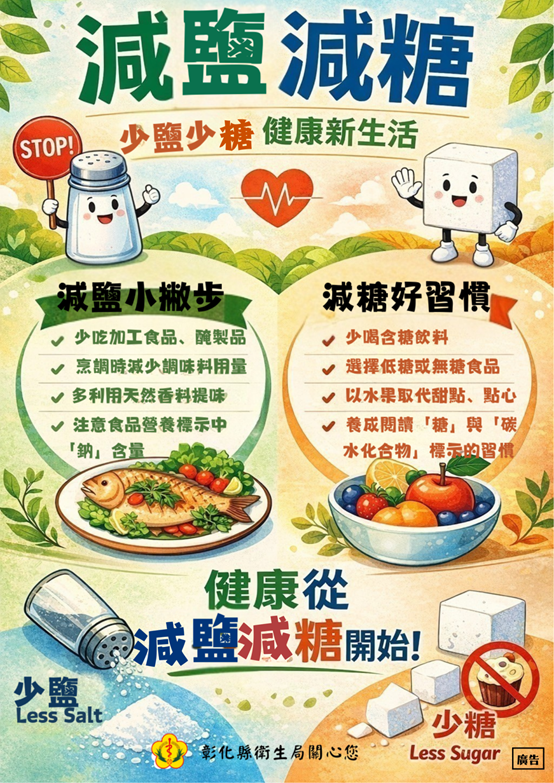 少鹽少糖 健康新生活,健康就從減鹽減糖開始。