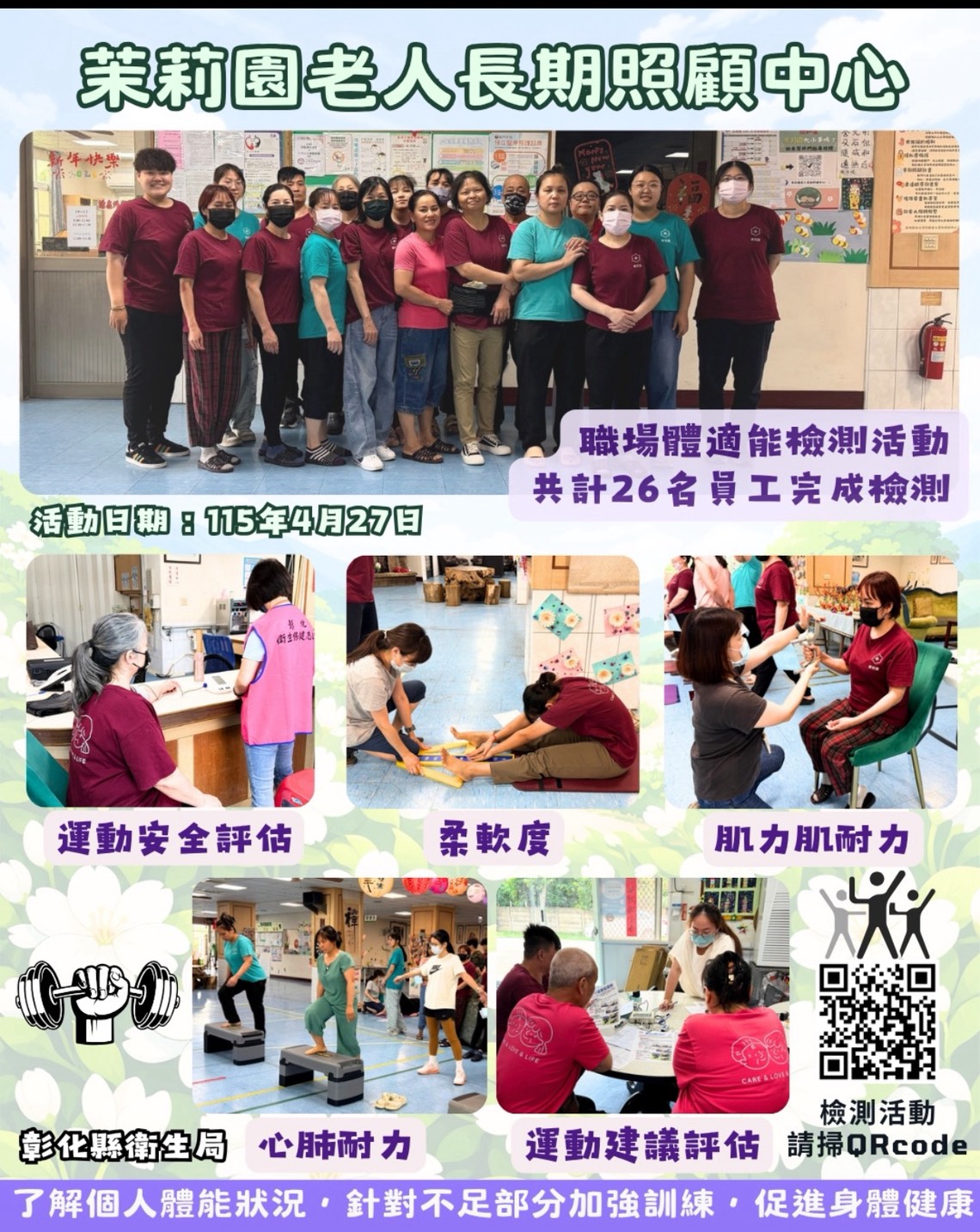 *彰化縣衛生局115年4月27日於茉莉園老人長期照顧中心舉行職場體適能檢測活動,共計26名員工完成檢測。